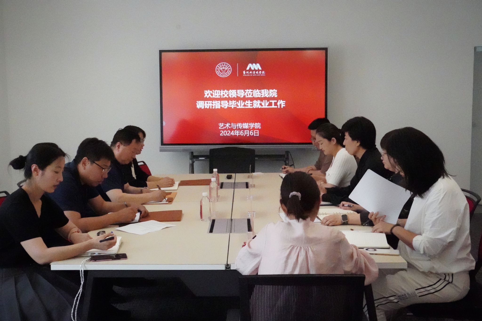 学院院长吕从娜、副院长刘旭、毕业生辅导员围绕行业环境、工作模式、经验做法以及工作中遇到的难点问题进行交流和讨论。