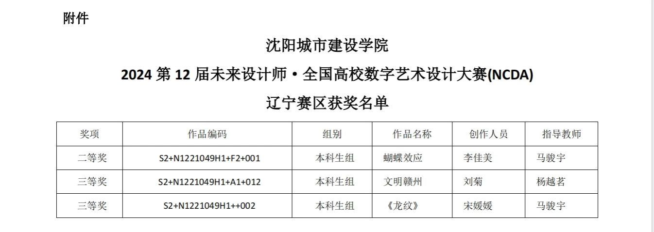 2024第12届未来设计师·全国高校数字艺术设计大赛(NCDA)是入选《全国普通高校学科竞赛排行榜》,多家教育厅认定,“学习强国”学习平台支持,对接联合国国际赛的国家级大学生竞赛。大赛秉承“设计为人民服务,培养未来设计师”的理念,坚持艺术与技术并重、学术与公益并重,倡导可持续发展,绿色低碳设计,传承红色文化,助力乡村振兴;鼓励大学生积极参与创新设计,用专业知识服务社会、拓展国际视野、培养团队协作精神。与此同时,《蝴蝶效应》、《文明赣州》、《龙纹》等作品也将学生运用数字技术对学生的综合实践能力做了全面展示。