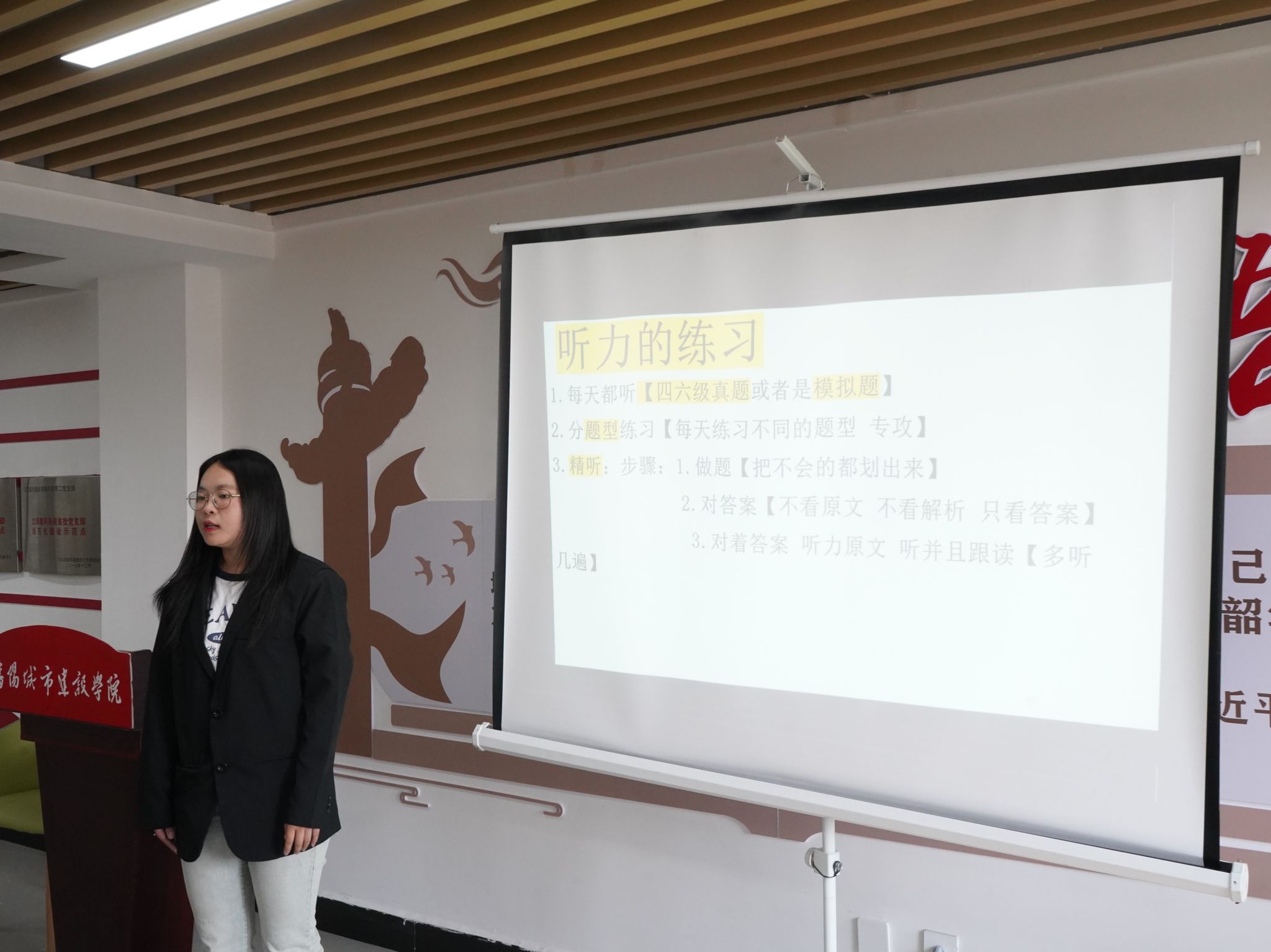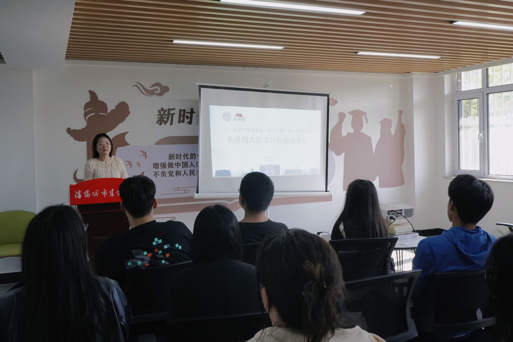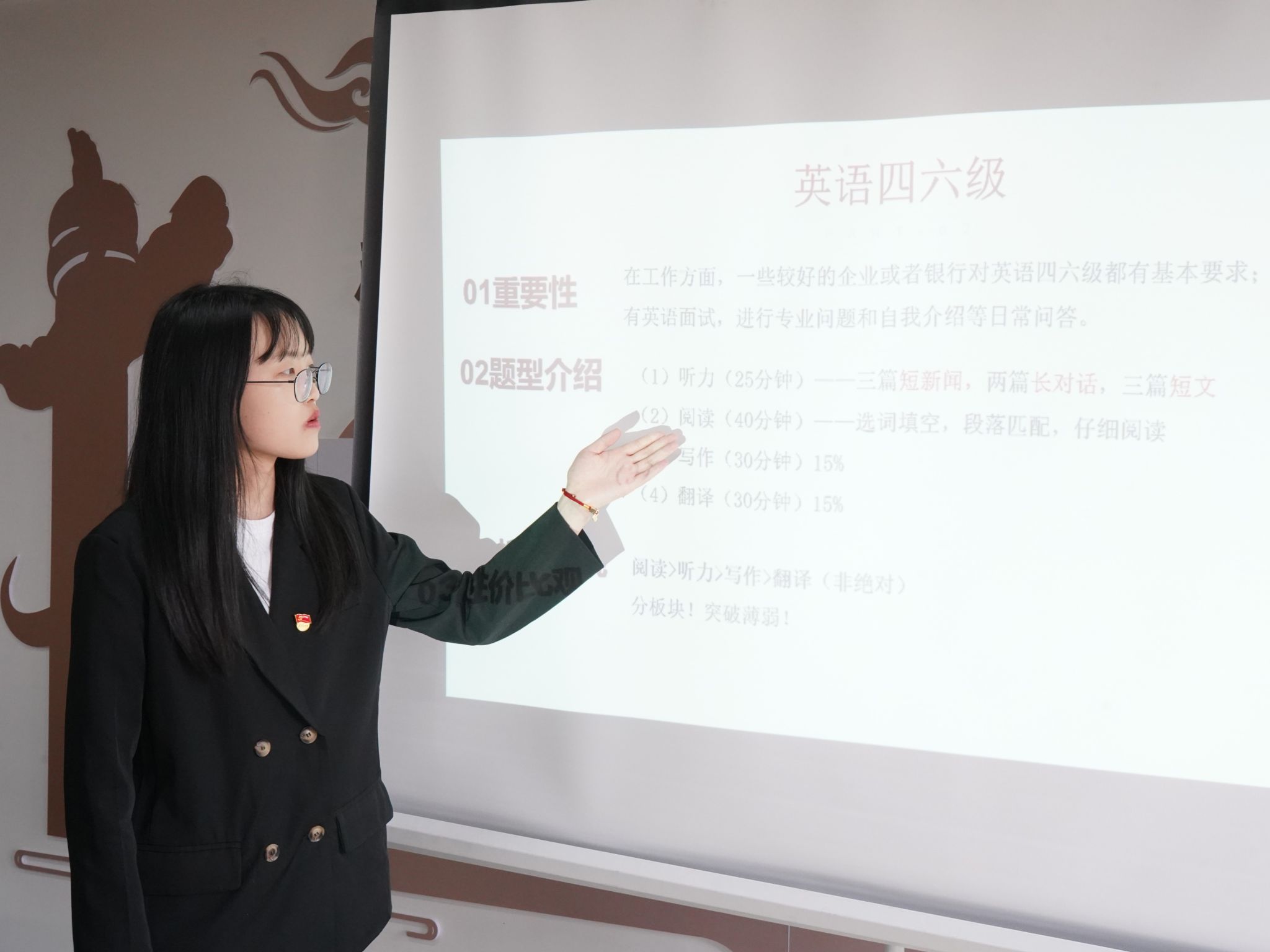 会上,两位同学从英语四六级听力、阅读、写作和翻译等题型入手分享了自己英语四六级的学习经验,介绍了四六级考试的题型和流程,并推荐了一些学习途径,提醒同学们要做好考前准备,并在日常学习中多听多练、做好词汇积累。两位同学还着重强调了四六级考试的注意事项,提醒同学们要合理分配考试时间,有条不紊地面对考试。并预祝同学们在四六级考试中取得佳绩。