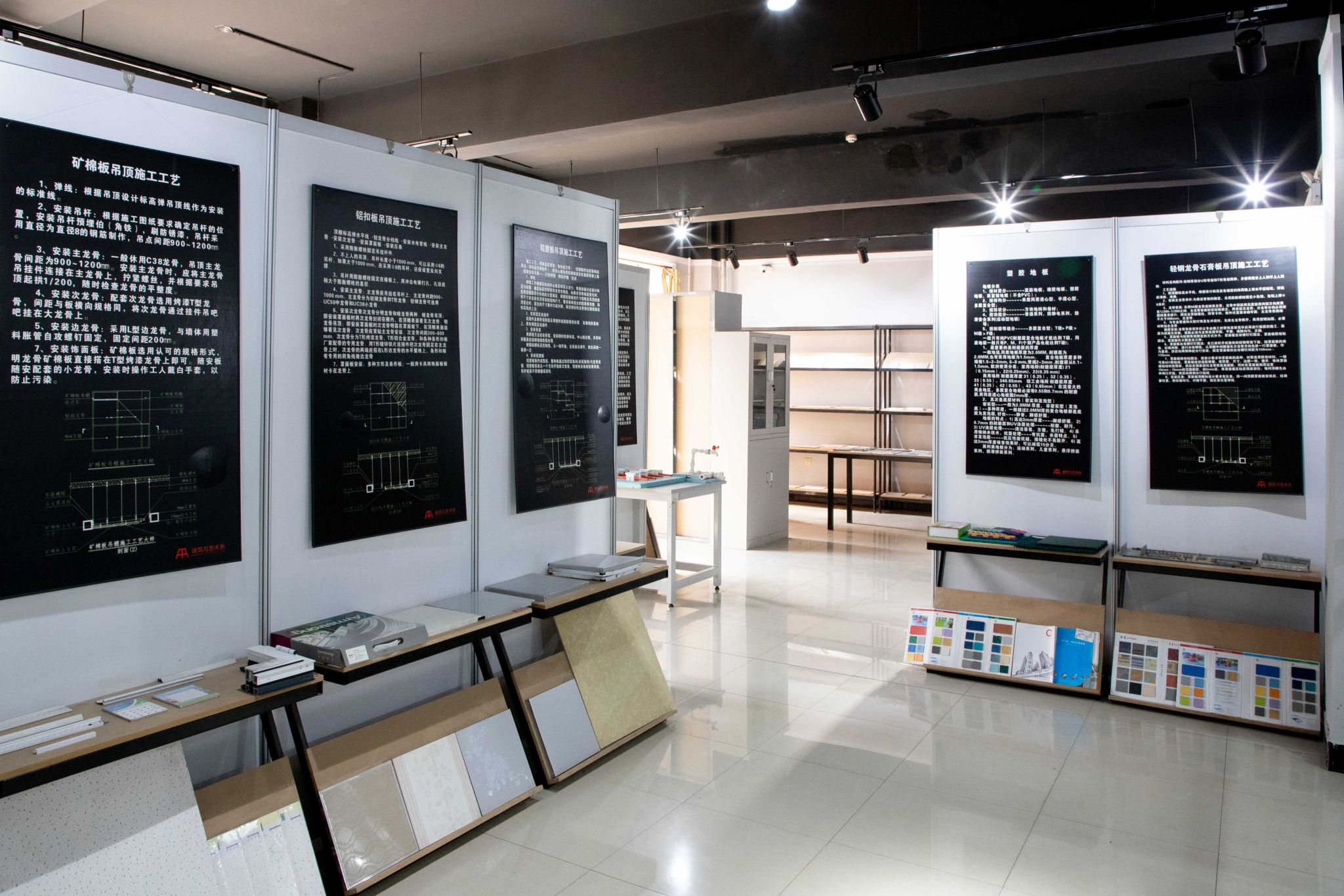 建筑装饰材料与构造认知实验室256平米,主要展示了各类建筑装饰材料、建筑装饰构造及施工工艺,如水路工程(上下水路)、电路工程(各类强弱电穿线)、瓦工工程、木工工程(包含吊顶)、油工工程。实验室中的施工工艺都是分步逐级断层显示,能最大限度的展示工艺的步骤和程序,使整体的施工流程清晰明确,便于学生学习掌握。